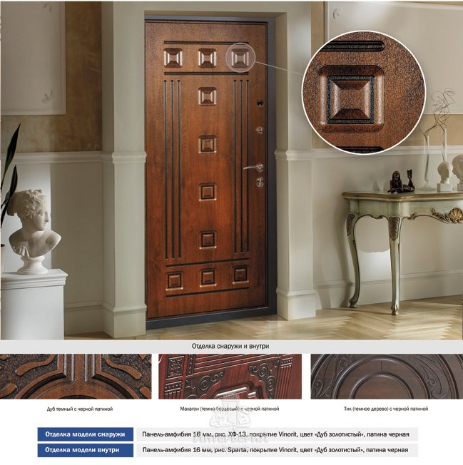 - Отделка внутри: Панель Амфибия 16мм, рис. Sparta, покрытие Винорит, цвет "Дуб золотистый" патина черная